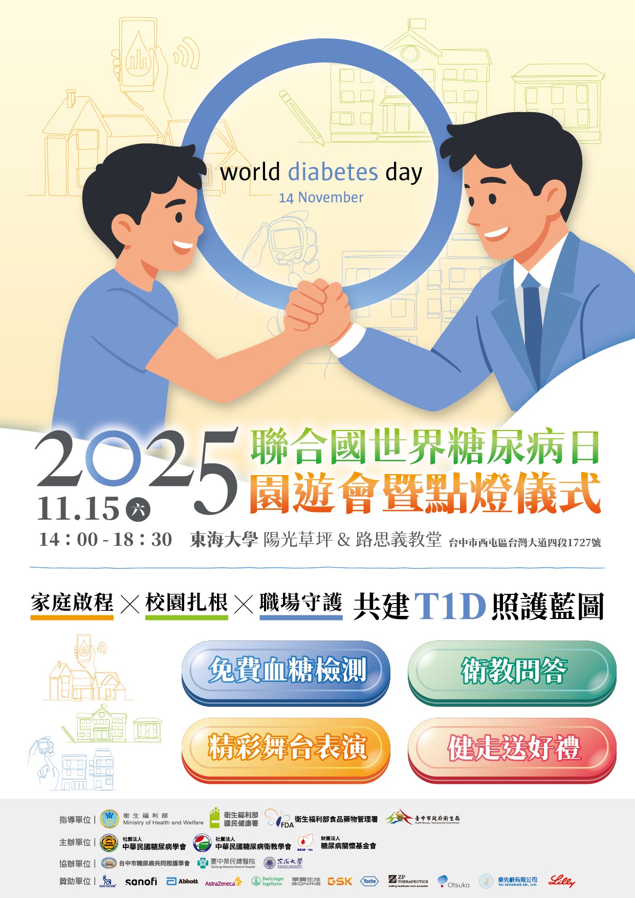 為響應2025聯合國世界糖尿病日,國民健康署與社團法人中華民國糖尿病學會等相關學協會及台中市政府衛生局等單位合作,於11月15日在台中東海大學陽光草坪舉辦「2025聯合國世界糖尿病日園遊會暨點燈儀式」,邀請民眾共襄盛舉!