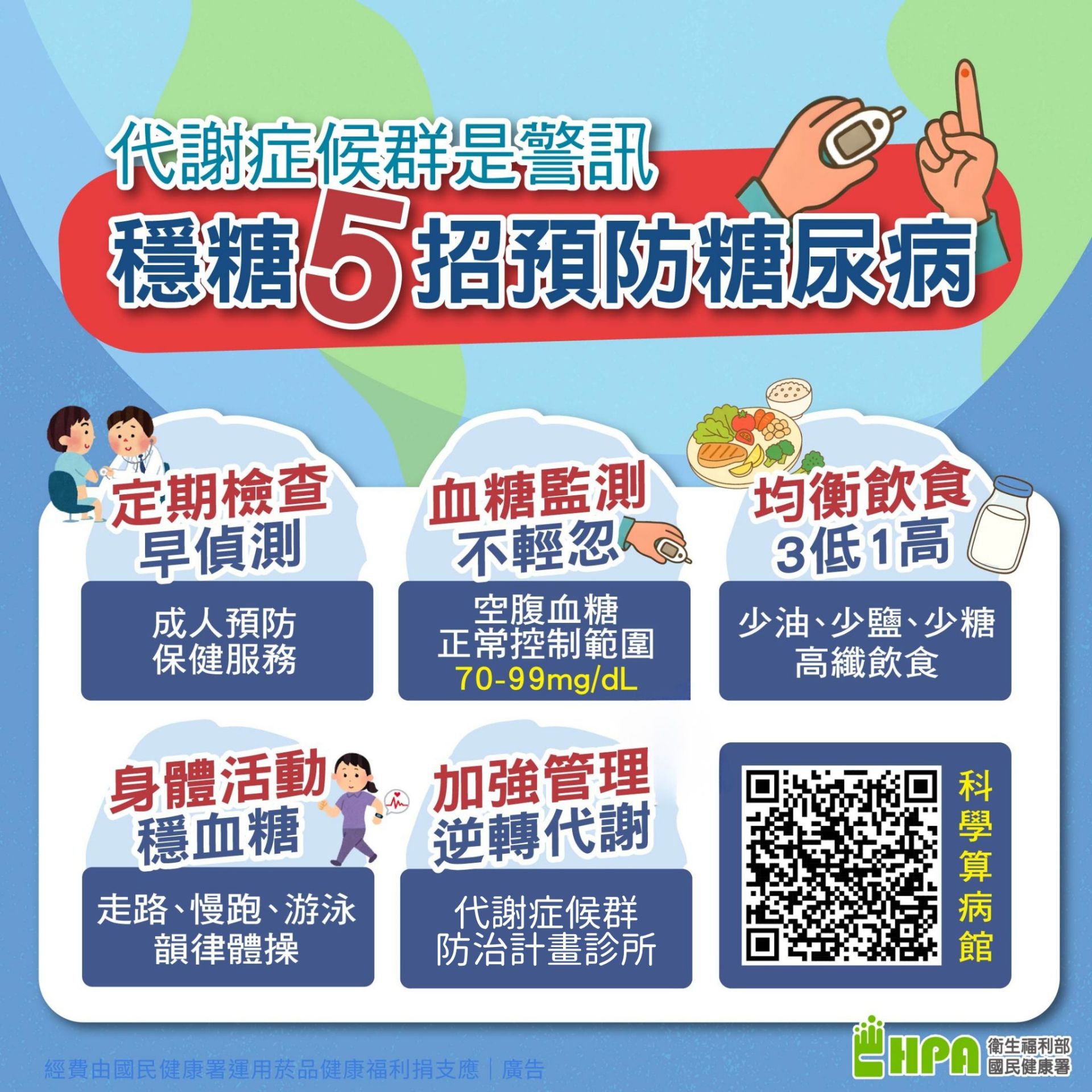 加強管理逆轉代謝:血糖異常伴隨腹部肥胖、血壓或血脂過高任兩項,即為代謝症候群。民眾應關心自身健康,落實個人健康管理,逆轉代謝症候群。