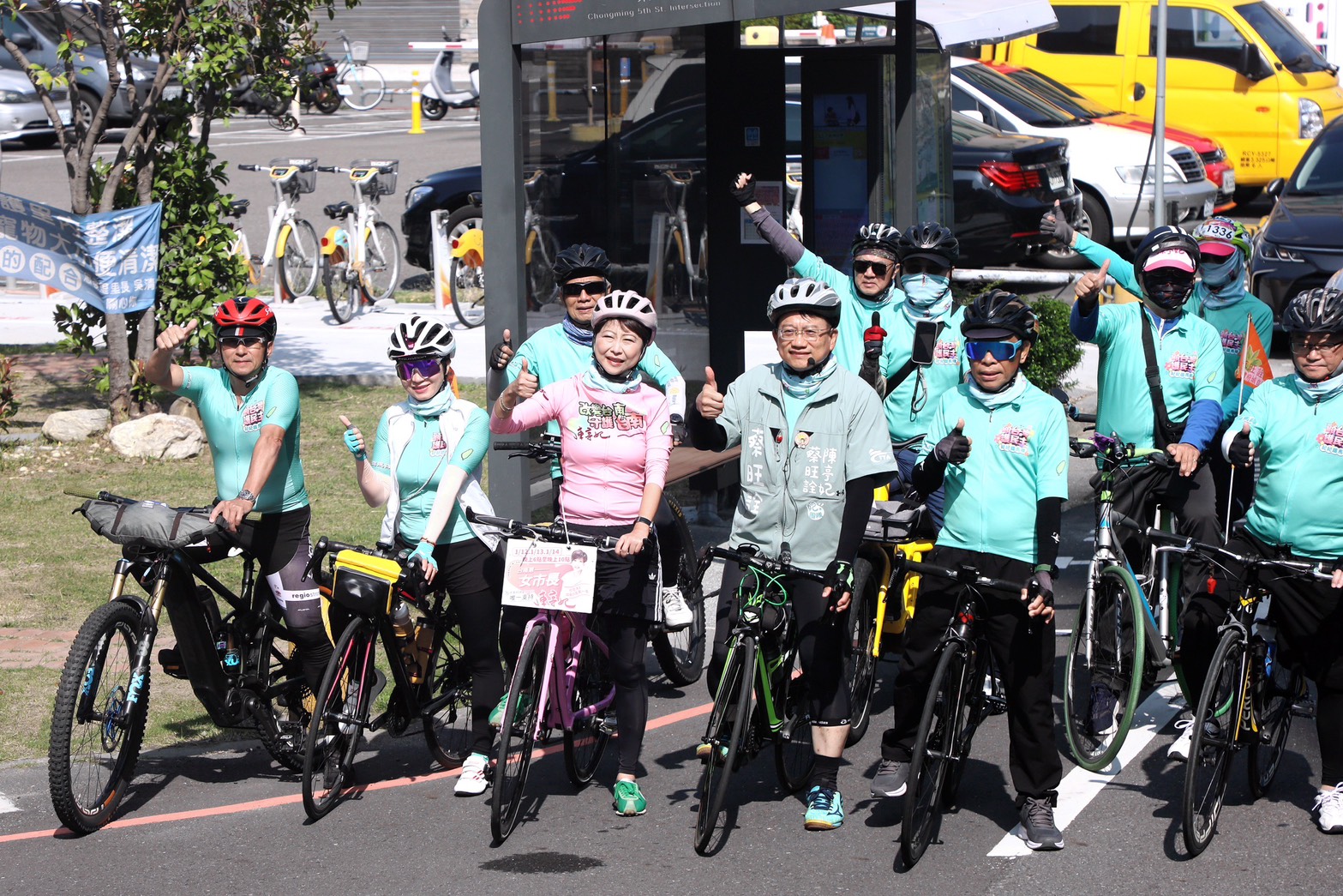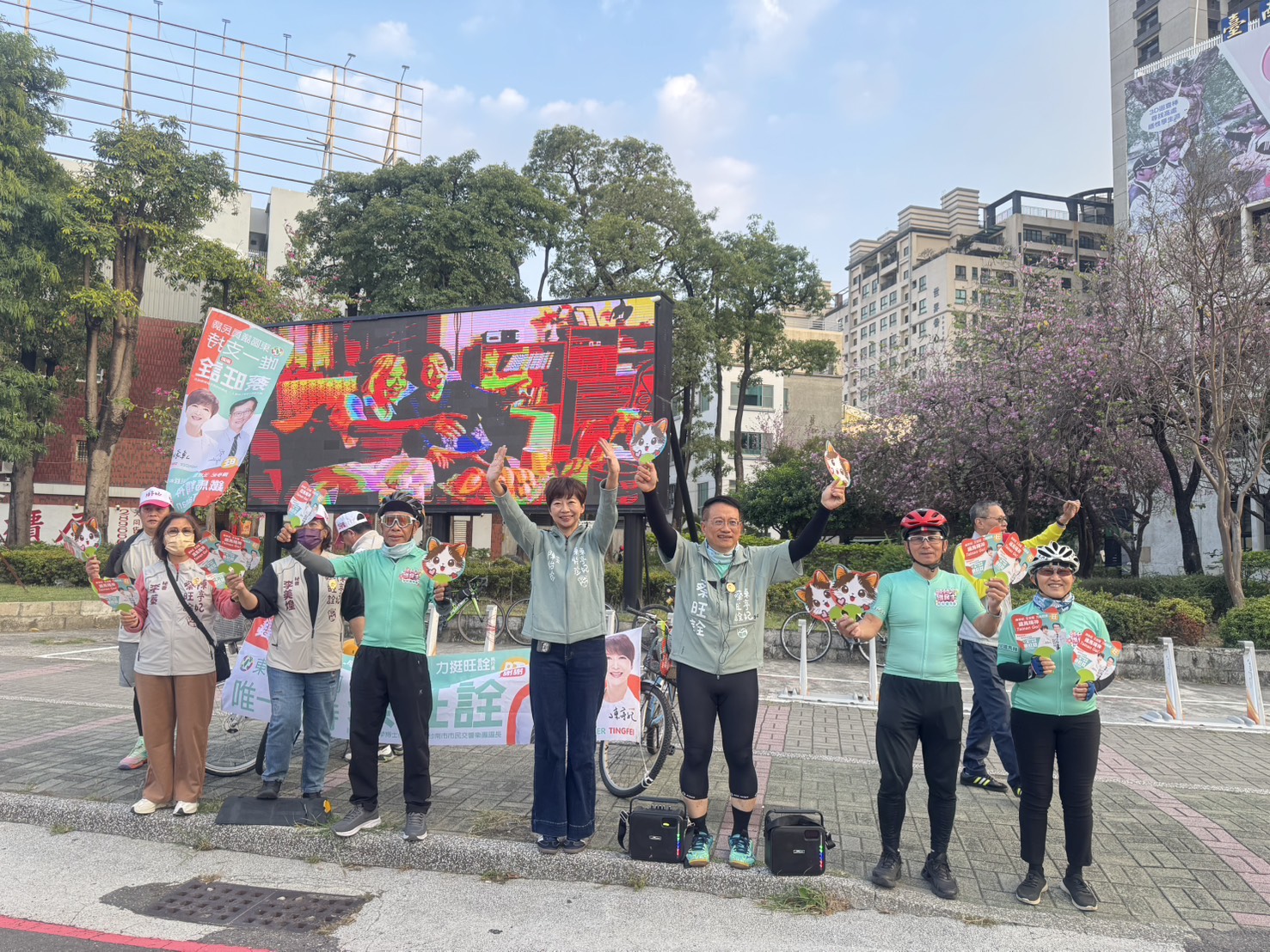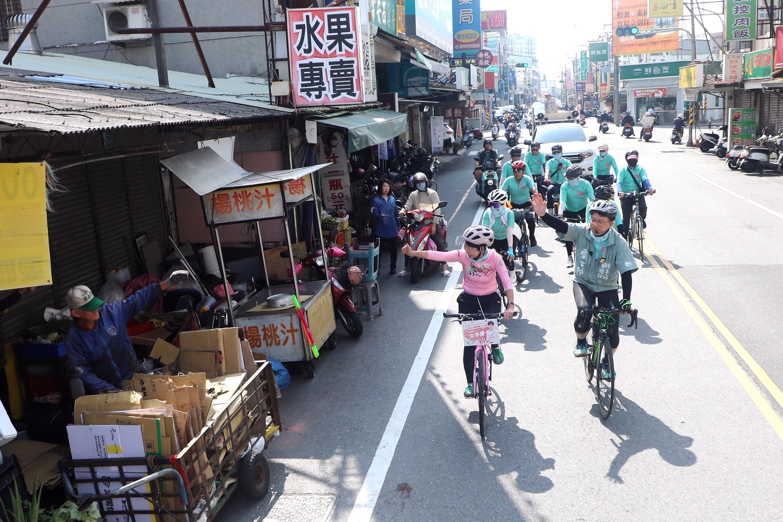 在烈日下,陳亭妃與蔡旺詮騎著腳踏車沿街拜票,不時向民眾揮手致意、請託支持。蔡旺詮也向市民朋友懇請,在3月9日至13日的電話民調中,給予「唯一支持」。