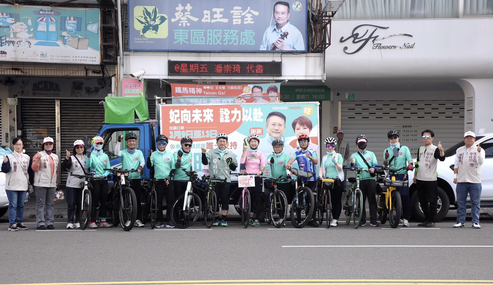 (7)日,立法委員陳亭妃也再度陪同蔡旺詮於台南東區騎乘鐵馬掃街拜票,持續深入各里巷弄,全力為即將到來的民調衝刺。
