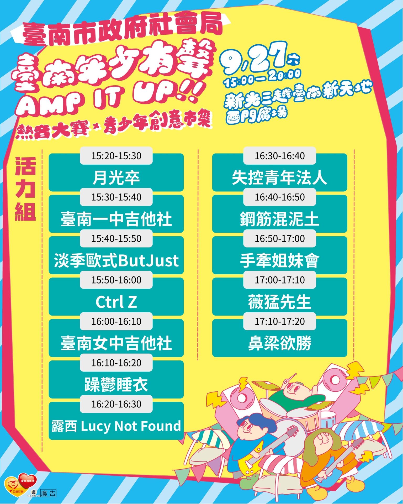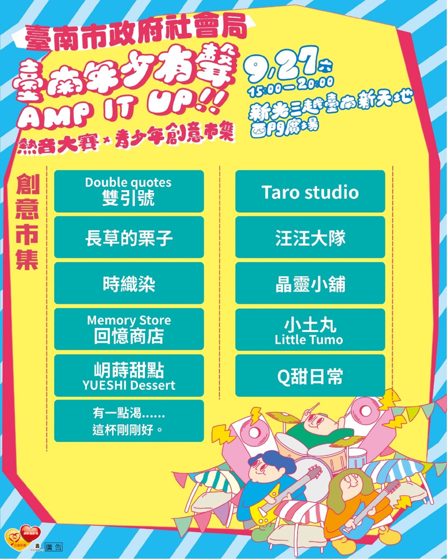 (記者 李昱祺/台南 報導) 台南市政府長期積極推動《兒童權利公約》(CRC),並透過多元活動宣導青少年「休閒、文化與參與」的權利。今年由社會局與台南市青少年福利服務中心首次以音樂與創意市集為主題,舉辦「臺南年少有聲 AMP IT UP!」,將於 9 月 27 日(星期六)下午 3 點在新光三越台南新天地西門廣場熱鬧登場。此次活動更吸引來自屏東、高雄、雲林、新北、嘉義、台中及台北等 7 個縣市的青少年組隊參與,與台南在地青年交流互動,共同展現跨縣市的青春能量。