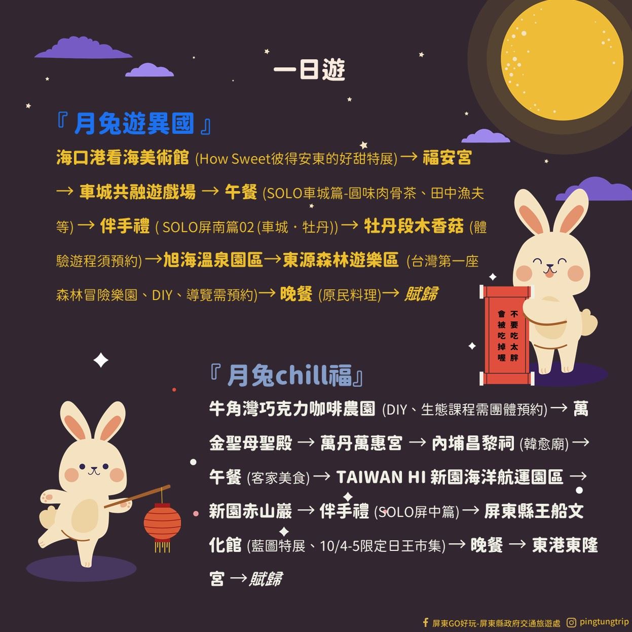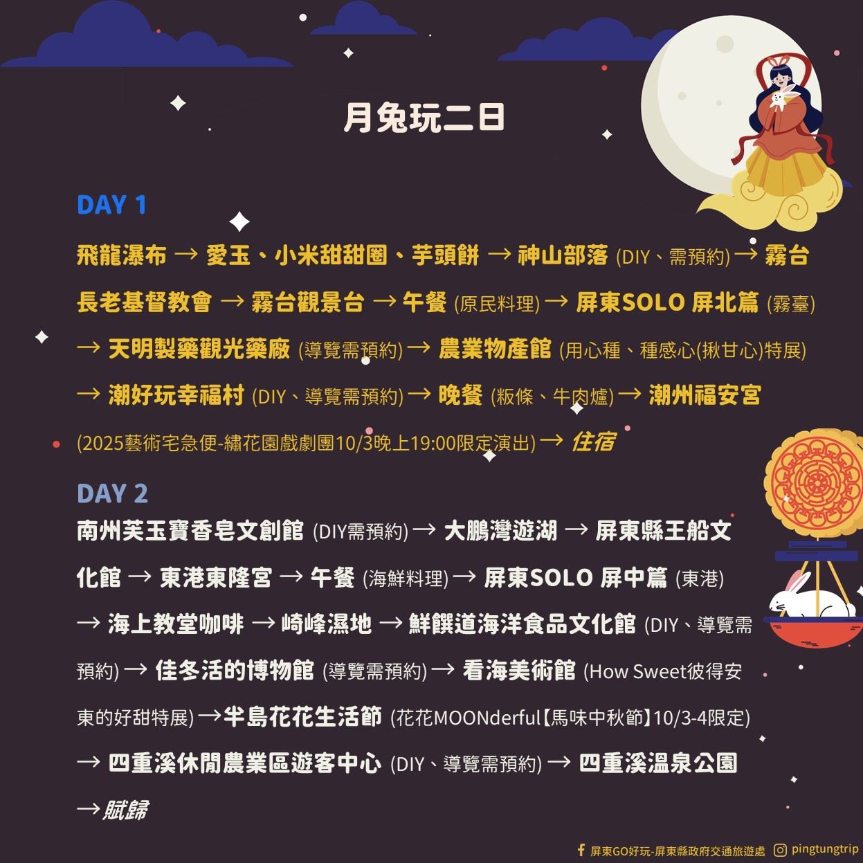 另外「月兔玩二日、三日」行程,將霧台部落文化、潮州藝術演出、東港漁村體驗,再延伸至恆春古城,更推薦翻閱SOLO特輯,邊吃邊玩邊買伴手好禮,絕不會錯過在地美食與特色住宿,快跟著「月兔」一起探險屏東,賞月之外也玩遍屏東,留下專屬中秋連假出遊回憶,就來屏東。