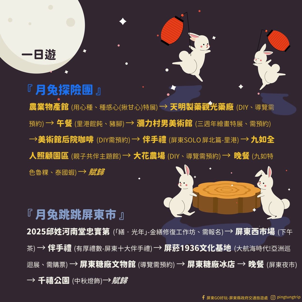 屏東縣政府表示,今年以中秋代表角色「月兔」為串聯主題,規劃一至三日遊程,讓旅客得以彈性步調探索屏東,像是「月兔探險團」行程,從農業物產館「揪甘心特展」出發,到瀰力村男美術館「三週年特展」,再到九如全人照顧園區與大花農場,完整串聯農產、藝術與親子互動,最後享用在地魯粿與泰國蝦,體驗屏東最接地氣的魅力,「月兔跳跳屏東市」邀請大家白天來感受屏東城市文化,與夜晚節慶熱鬧兼具的雙重氛圍。
