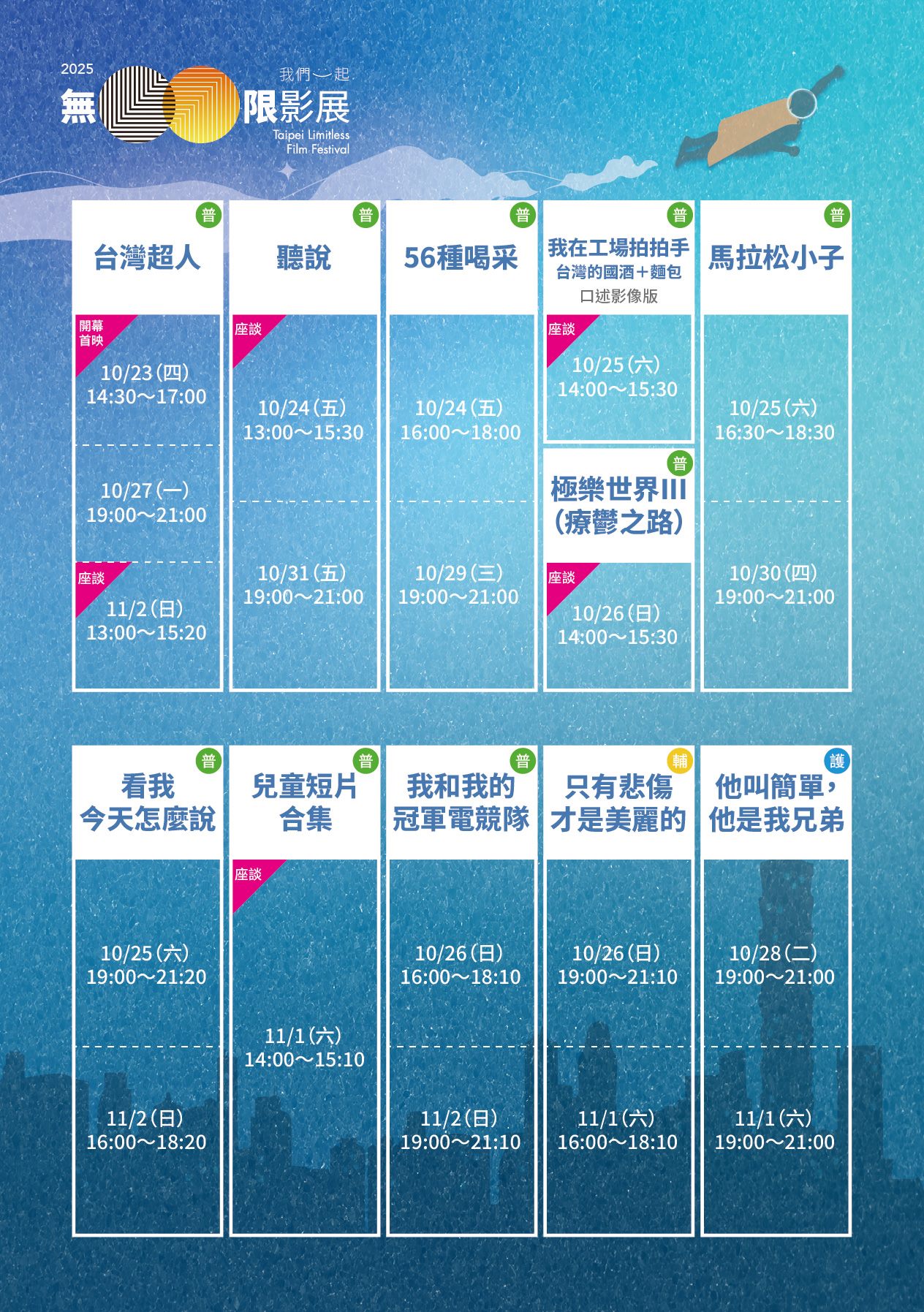 今年也特別規劃口述影像版本的《我在工場拍拍手》,以及以過 動症、視障、憂鬱症為主題的《兒童短片合集》,首次結合親子放映, 讓大小觀眾在觀影中不僅體驗多元生命的力量,更能理解「無障礙」 如何成為教育、就業與社會參與的重要基礎。這些影片不僅是故事, 更是一場場真實的對話,邀請大家透過電影感受差異,進而學會擁 抱不同。 《2025無限影展》自10月9日(四)起開放免費索票,索票方式及 活動詳情請上影展官網或票券平台。