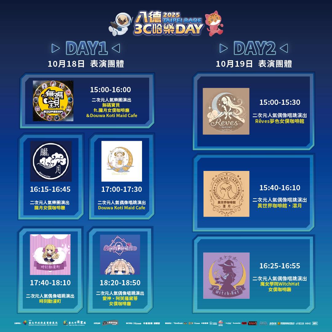 舞台區同樣熱力滿點,10月18日除知名樂團「無碼寶貝」與現場偶像聯手帶來跨次元合作演出,週末2日也有多組充滿魅力與個性的二次元偶像輪番登場帶來華麗又療癒的視覺饗宴!10月19日「二次元週」尾聲更將迎來壓軸「二次元偶像大合跳」,眾多偶像齊聚舞台前,萌系光環光芒四射,電翻八德資訊商圈!