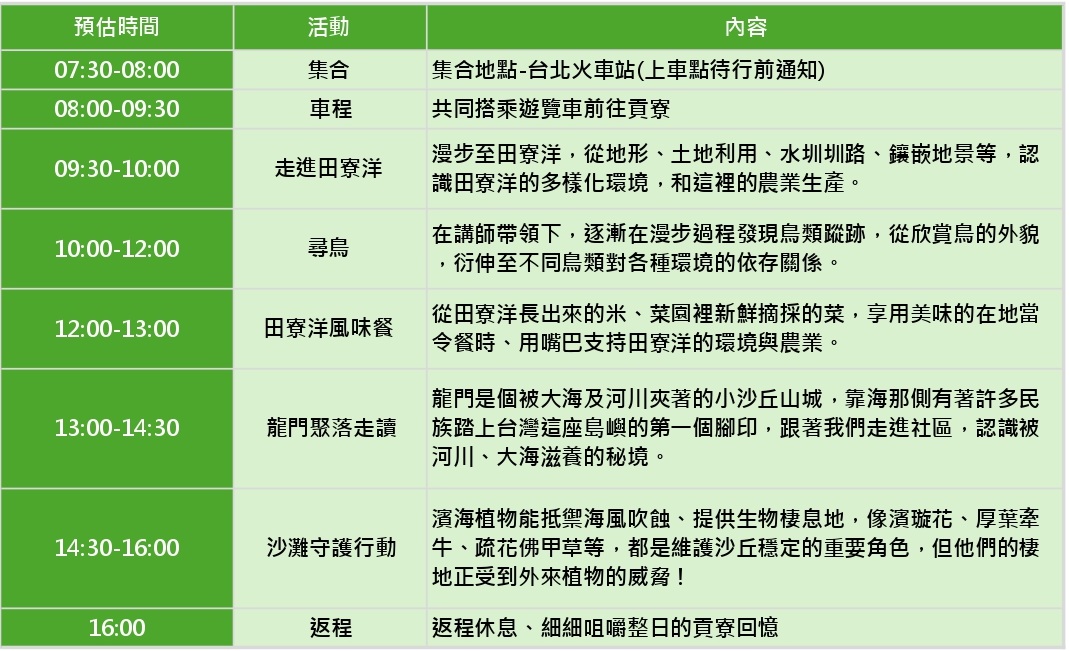 本次小旅行上午將由長期觀注貢寮生態保育的人禾基金會,帶領民眾進入田寮洋賞鳥,觀察雁鴨、鷸鴴、鷺鷥、猛禽等鳥類的身影,也讓大家認識這片以友善耕作維護生態平衡的農田景觀,還會體驗用再生稻梗編織象徵吉祥的注連繩繩結。中午則享用田寮洋所生產的羽豐米及在地當令風味餐,用嘴巴支持田寮洋的生態保育。
