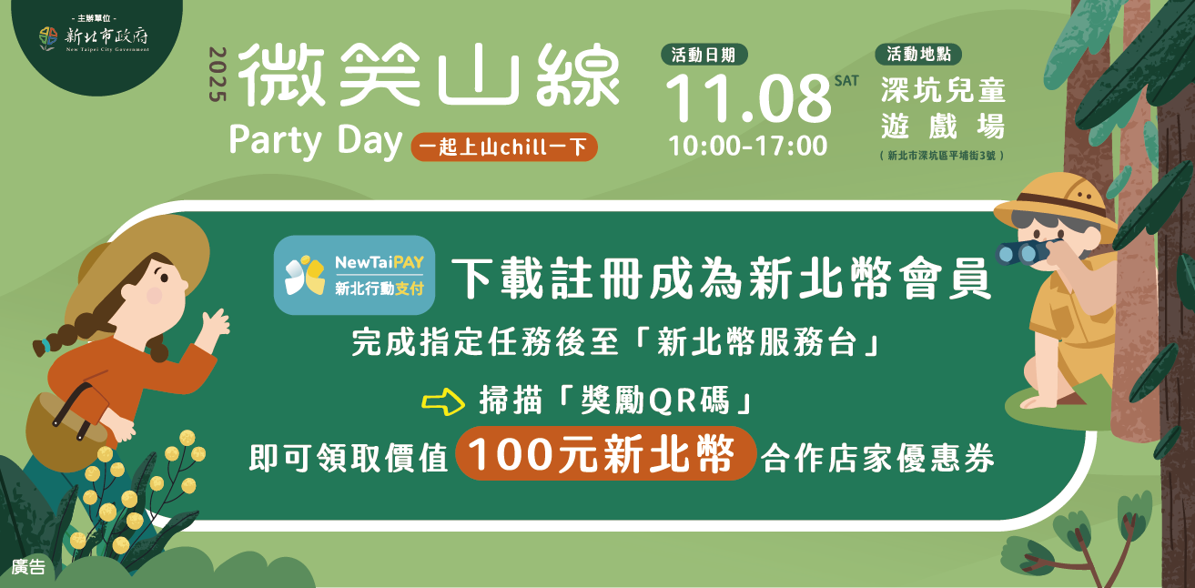 Party Day活動內容有趣味好玩的闖關、知識競賽以及手作體驗、精彩豐富的舞台表演及優質特色的「森Chill市集」,本次也邀集微笑山線五家服務據點與15家獨立品牌攤商,販售文創、手作與山城特產,並導入「新北幣 NewTaiPAY」數位支付回饋機制,只要完成指定任務即可領取100元新北幣合作店家優惠券,鼓勵民眾以行動支持在地店家,形成社區正向循環。