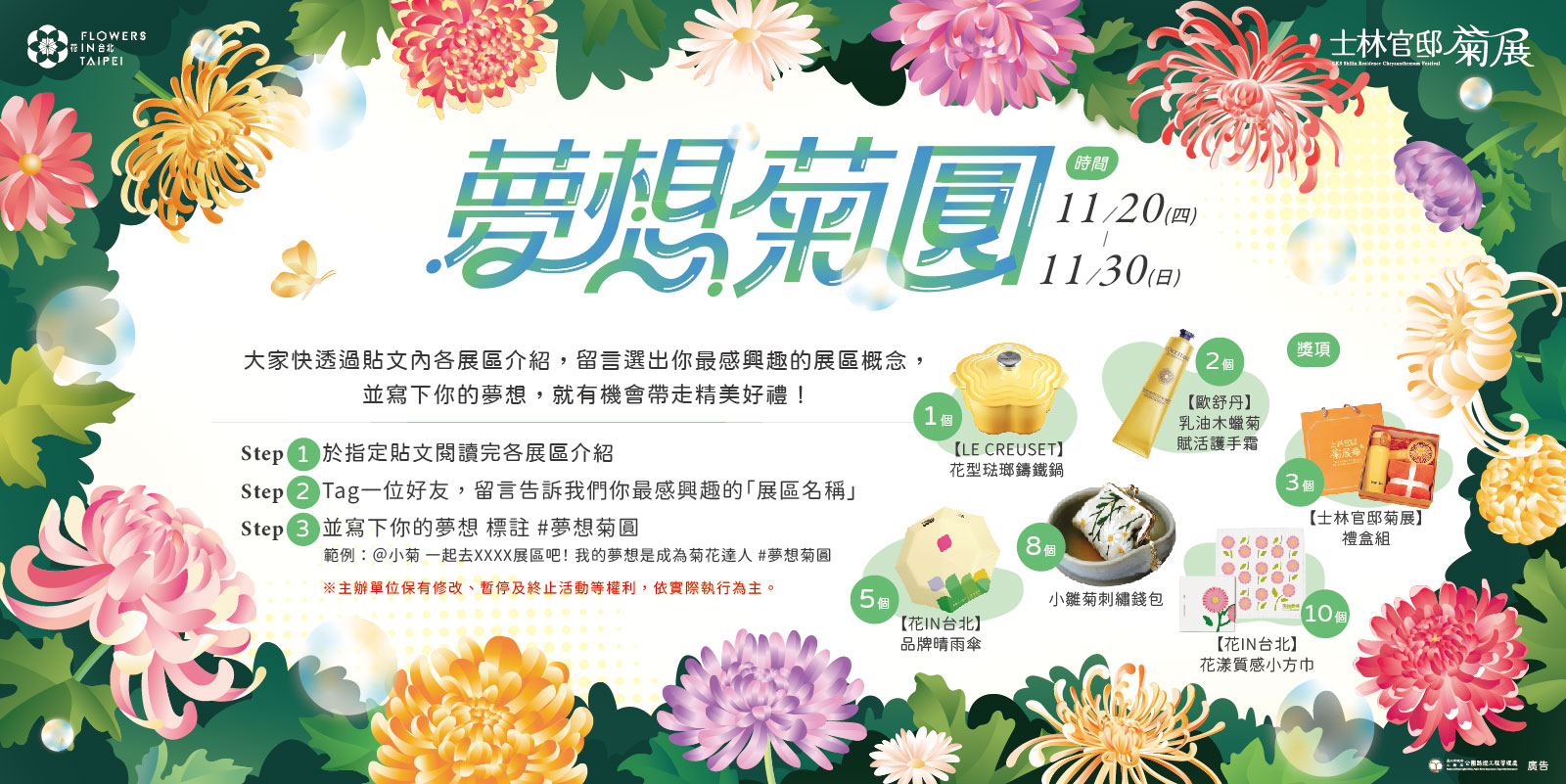 園藝管理所吳旻靜主任補充,今年的主視覺海報暗藏展場路線巧思。從士林官邸花卉大道起步,遊客將依序穿越以童話故事為靈感的夢花園、充滿日式風情的和傘花徑、象徵蛻變的蝴蝶意象,再走入代表幸福的家園,最後搭乘熱氣球環遊世界,展開一段追尋心願的旅程。整條動線如同人生的時間軸,串連起築夢的每一個階段,沿途綻放的菊花宛如生命歷程的映照在成長的每個時刻,都能綻放屬於自己的光彩。