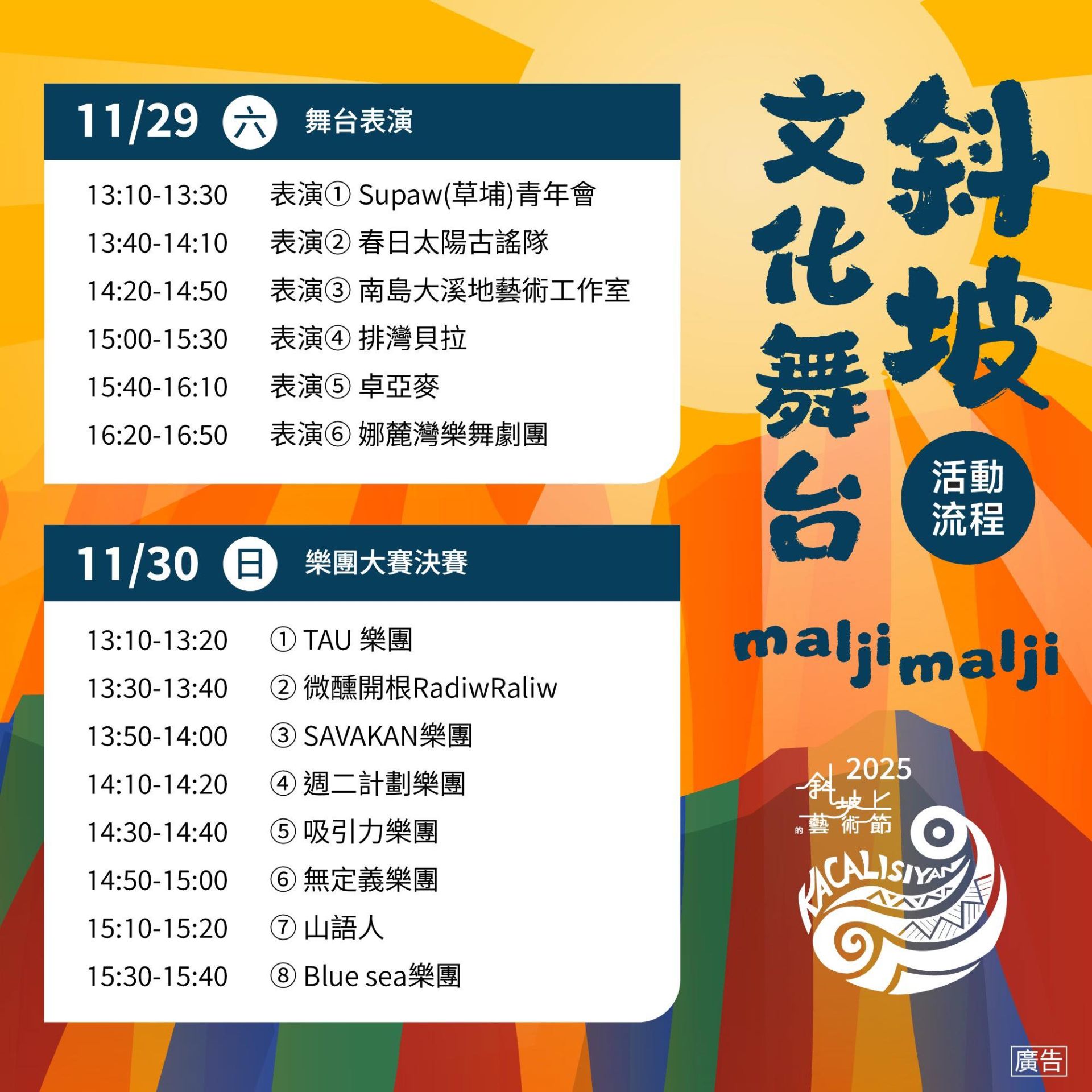 除主舞台外,「斜坡文化舞台」首日將由Supaw草埔青年會、春日太陽古謠隊、Te Natira’a南島大溪地藝術工作室、排灣貝拉、卓亞麥、娜麓灣樂舞劇團輪番登場,帶來從古調到南島樂舞的精彩演出,展現屏東豐厚的族群音樂樣貌;隔日則由年度矚目的「斜坡樂團大賽決賽」接棒登場,八組入圍樂團將以多元曲風展現音樂實力,透過現場演出展現舞台魅力與音樂張力,角逐最高10萬元獎金,延續斜坡上的藝術節長年扶植新聲、推動原民音樂發展的精神,為文化舞台注入青春能量與創作火花。