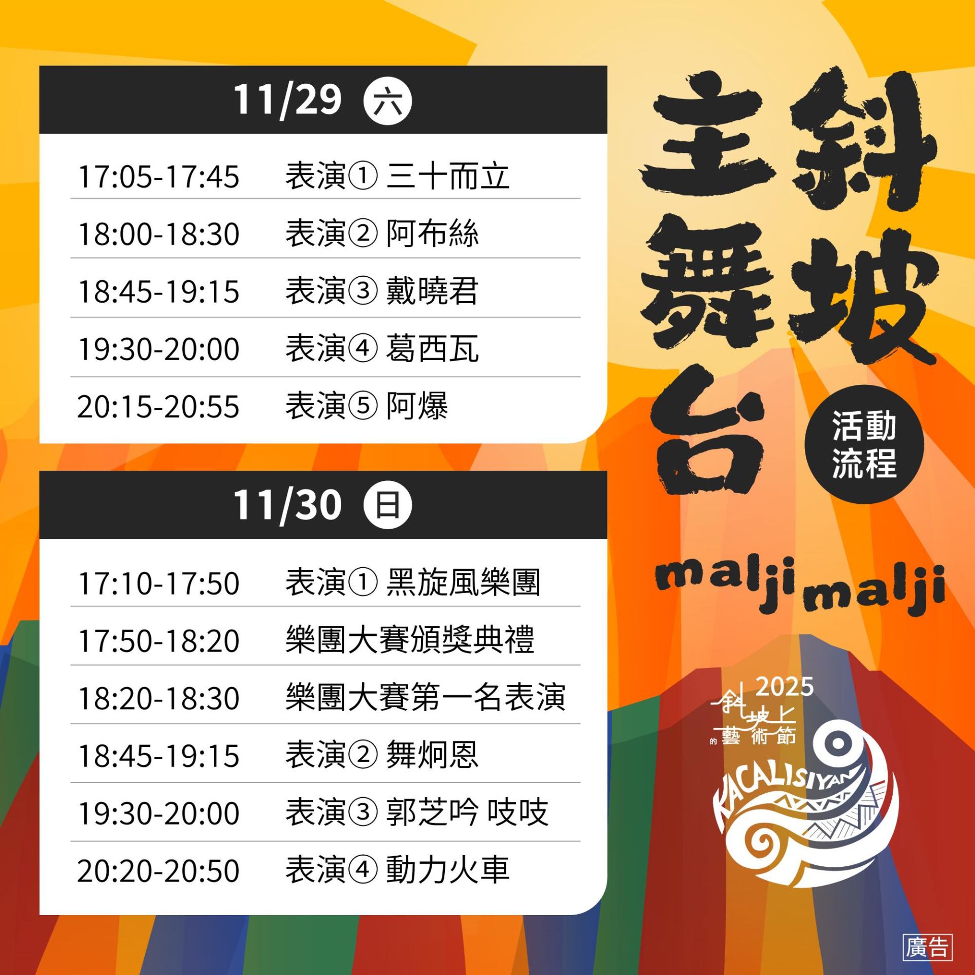 (記者 陳予昕/屏東 報導) 2025「斜坡上的藝術節」將於11月29日至11月30日在屏東潮州林後四林平地森林園區盛大登場!今年以「malji malji 唱響山海」為主題,傳遞人與人、文化與土地之間最溫柔的連結,活動橫跨兩日,集結主舞台斜坡大舞台、文化舞台、斜坡上的SIUBAI市集、童玩體驗與大藝術創作等多元內容,打造山海之間最具代表性的原民藝術盛典。