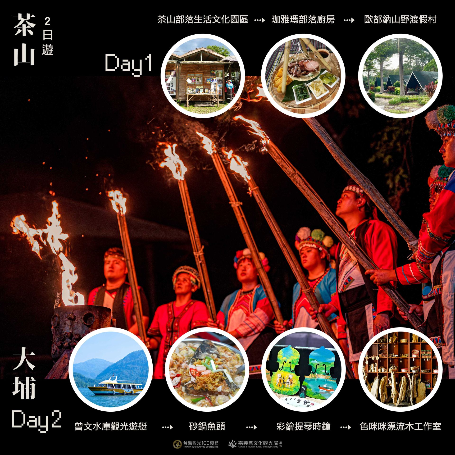 文觀局表示,位於阿里山的「茶山部落生活文化園區」是推動鄒族文化觀光的重要據點,園區以傳承鄒族文化為核心,設計了多樣體驗活動,包括傳統團康舞、搗麻糬、射箭、吹月桃鳥笛與甩風笛等,遊客以互動方式深入了解部落生活與文化精神。
