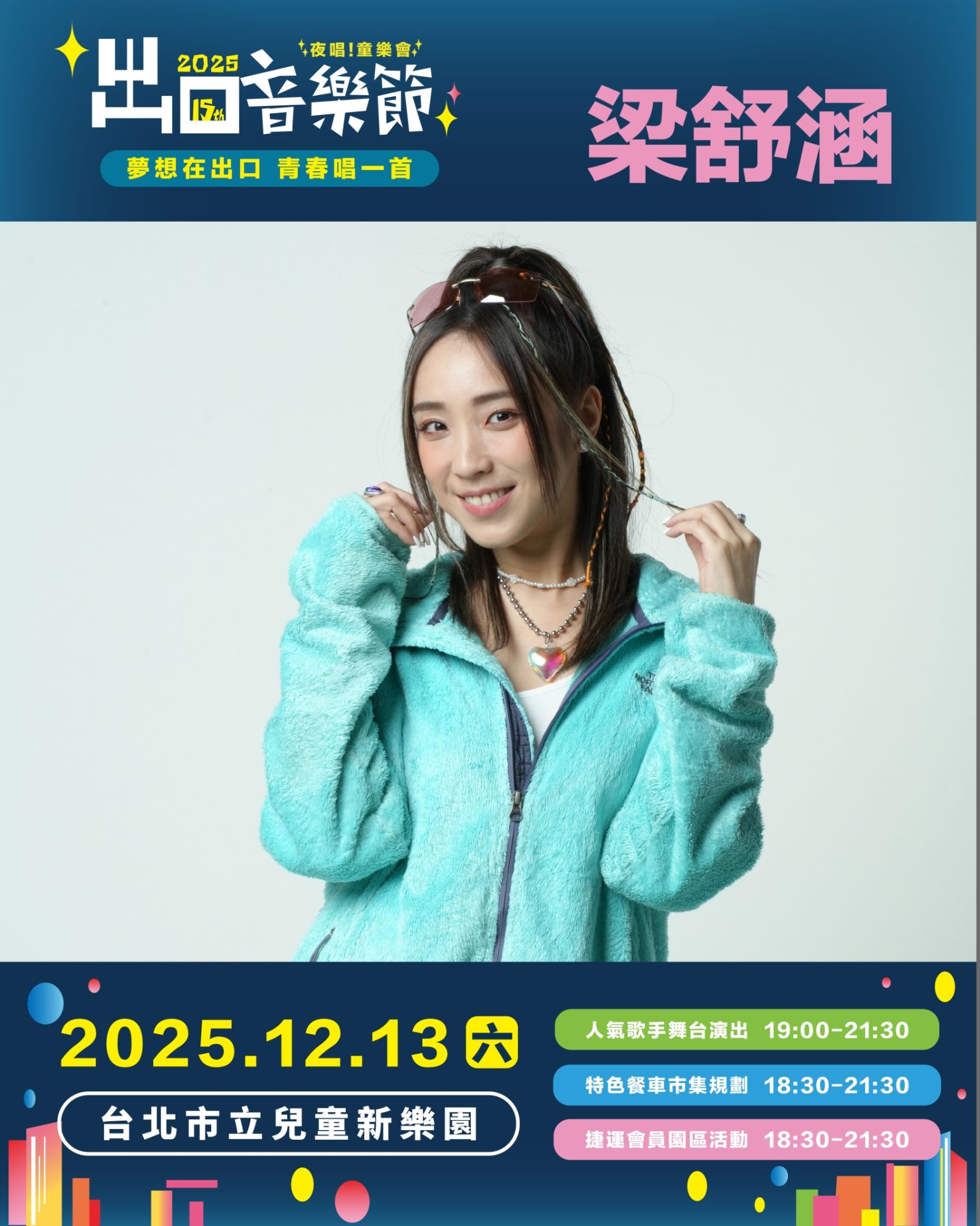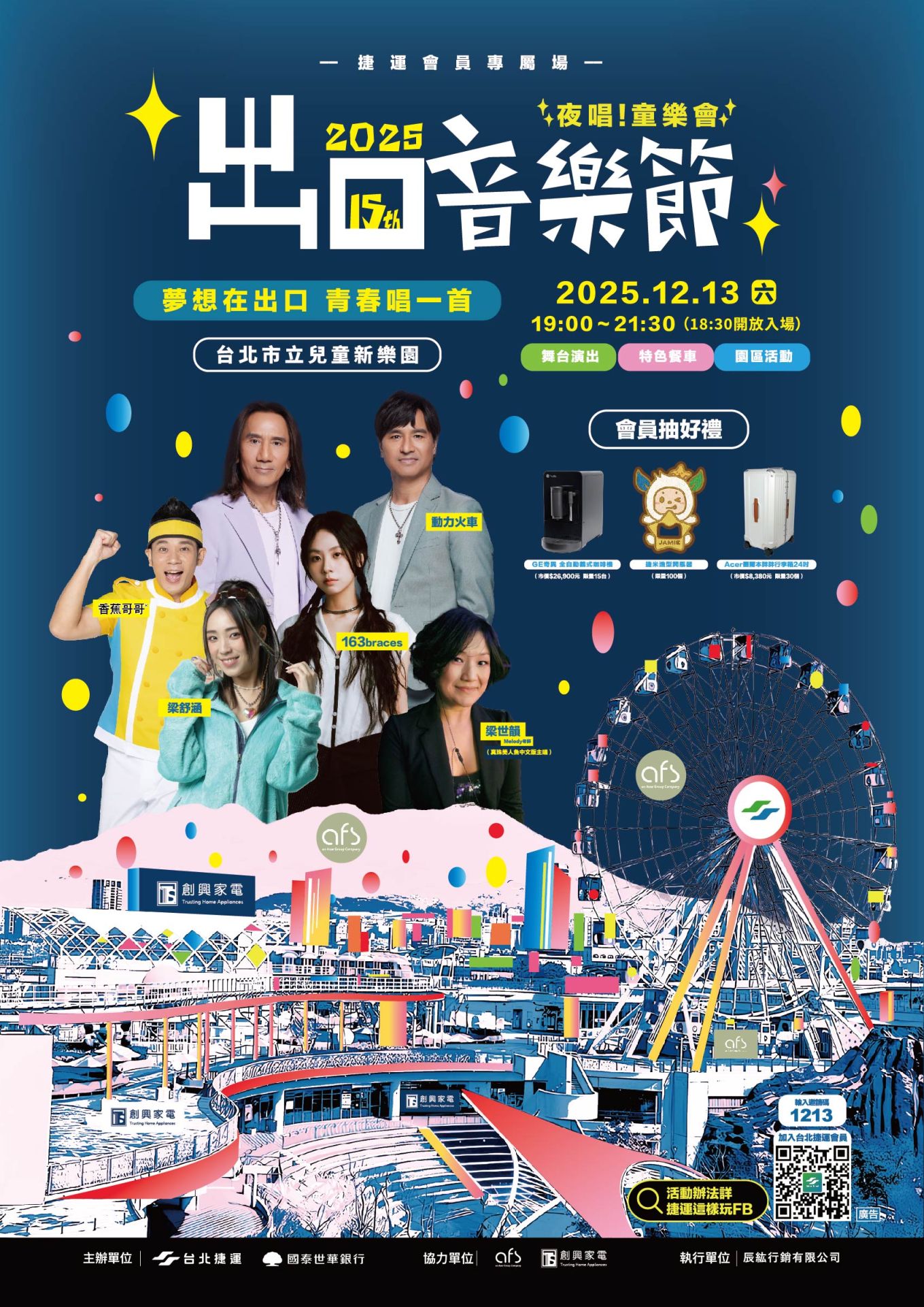 (記者 趙紫璇/台北 報導) 2025出口音樂節,今年首度移師兒童新樂園登場!今年邁入第15屆的出口音樂節,以「夜唱!童樂會」為主題,即將於12月13日晚間在兒童新樂園夜間包場舉辦會員專屬場,活動除精彩演出外,也將開放園區遊樂設施免費暢玩,打造音樂、娛樂與童趣兼具的年度壓軸盛會!11月21日中午12時起,「台北捷運Go」App會員憑10點捷運點,即可兌換限量優先入場券1張;若錯過優先入場券也不要失望,活動當日App會員持綁定電子票證搭乘捷運,並出示搭乘紀錄,即可免費入場,快把這場冬季最療癒的童樂派對收進行事曆。
