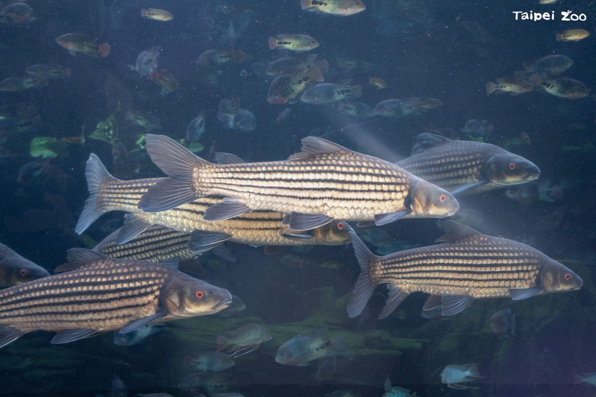水池裡少數不產於南美洲雨林流域的魚種,是來自東南亞熱帶河川的穗鬚原鯉,是野外族群岌岌可危的極度瀕危魚種,因為海關查緝走私動物而收容入園。牠們布滿縱線條紋的身體可生長達1公尺以上,但卻喜歡群游在水域下層覓食,放空般的鮮紅色大眼,搭配不斷朝下伸縮搜尋食物的大嘴,群游時彷彿一整群遙控吸塵器出動。慈鯛科的紫紅火口來自中美洲,頭部帶有亮麗的粉紅色,在穿山甲館水池裡相當顯眼,牠們有保護幼魚的習性,因此有機會看到大魚和小魚靠近仿岩或池壁活動。