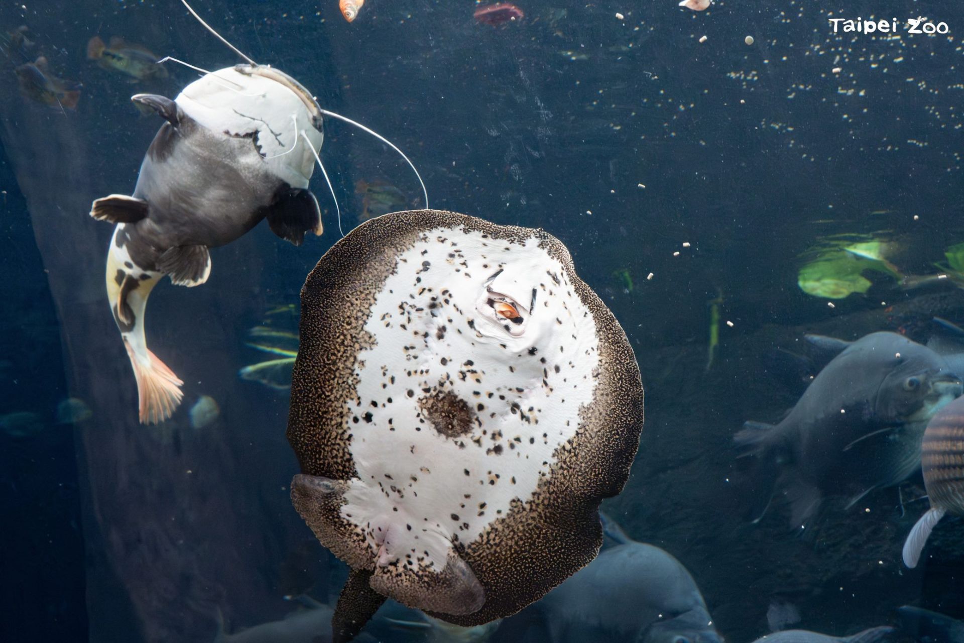 穿山甲館水池中的魚類喜歡活動的區域各有不同,身為亞馬遜河霸主的象魚,龐大的體型總是吸引大家的目光,不過有時會棲息在水池後方陰影處,反而從水池上方的步道俯視才容易發現。相對體型較小,大約手掌大的紅勾銀板則是成群結隊出現,彎月狀的尾鰭讓牠們可以敏捷穿梭水域中層。黑帝王魟盤狀的身形讓牠們適應水域底層的環境,如果沒注意看甚至不會發現魟魚正貼在池底。不過黑帝王魟也經常沿著缸壁游動到透明隧道上方,有時在隧道抬頭向上看,就會發現魟魚白色的腹部正對著你呢!