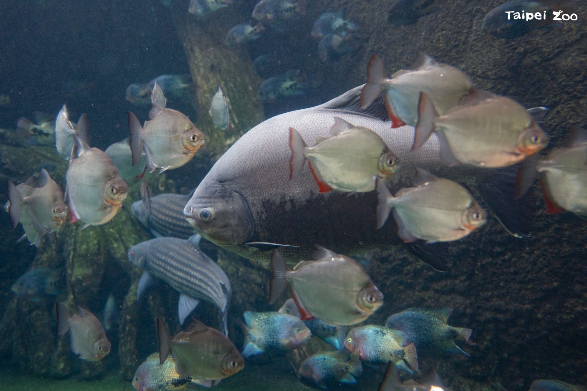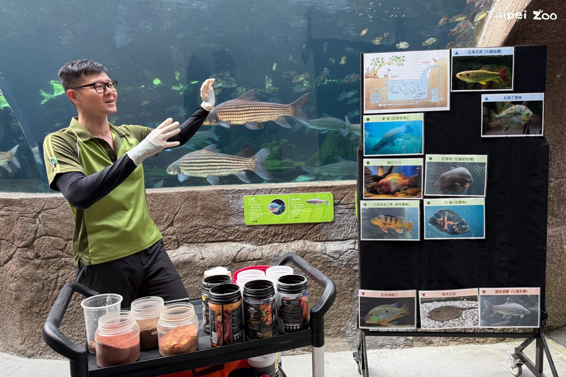 (記者 趙紫璇/台北報導) 臺北市立動物園的熱帶雨林室內館─穿山甲館,有座模擬亞馬遜河底部的大水池,照養著來自雨林裡溪流或湖泊中多樣的淡水魚類,大小魚群在不同水層共游的景象十分壯觀,遊客佇立「河底隧道」內,就能深刻體驗如同和魚群共游的臨場感。當自然陽光穿從波光粼粼的水面,穿透水體灑下的絢麗光影,更是許多遊客參觀時必拍的景象。為了讓池內多種生態習性及體型各異的魚類一起生活,保育員們可是得費心構思照養方式!除了在水池底部擺放幾可亂真的仿樹根、仿沉木等提供小型魚類們躲避空間,也要透過加溫設施和強勁的過濾系統來維持水體環境品質的穩定。多種「魚口」要餵飽才能彼此相安無事,這可就要仰賴保育員用心經營的「鱻食堂」,以多樣又營養的食材照顧好魚群,才能讓牠們健康又自在的混群悠游。