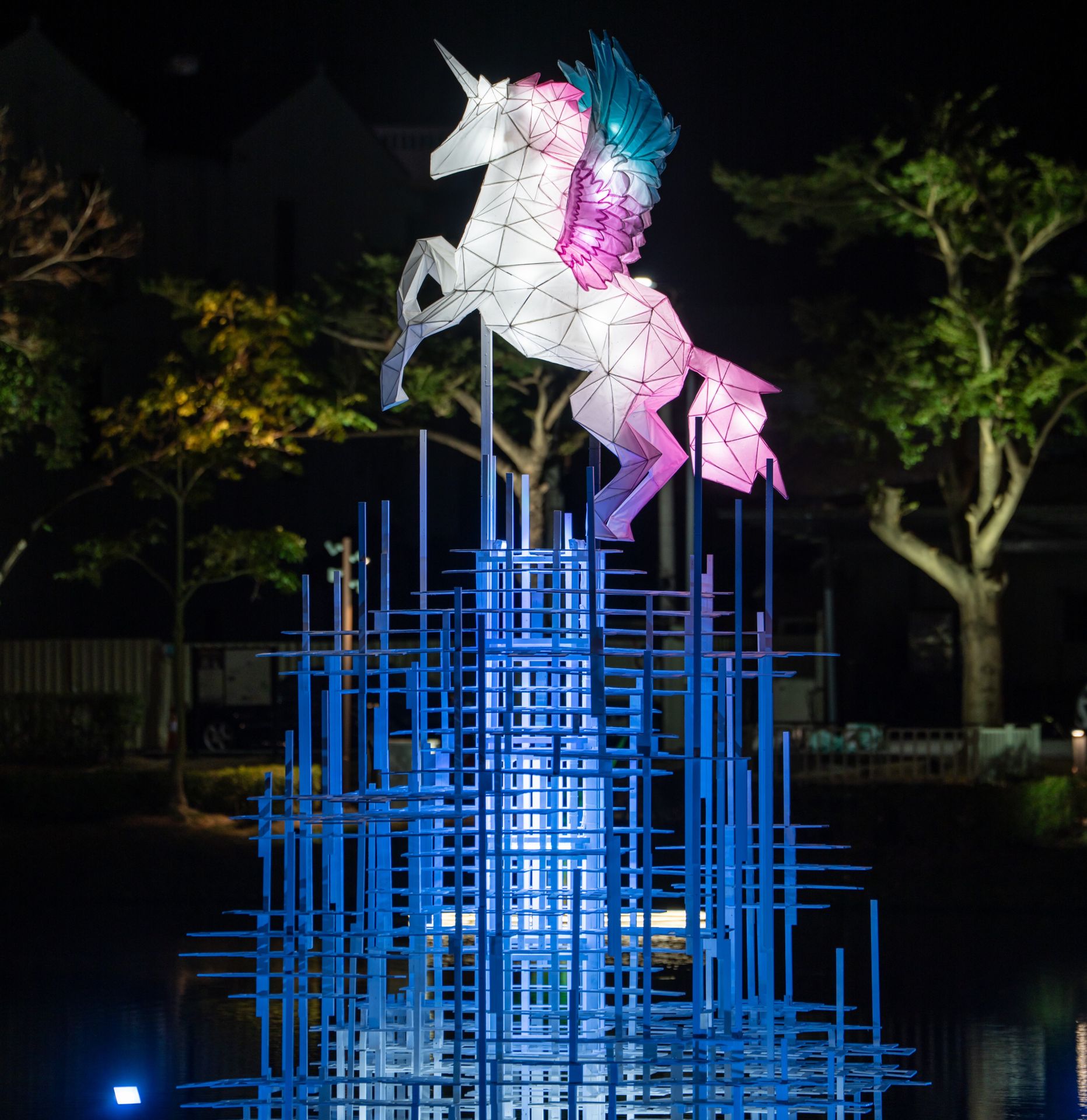 文化局提到,今年適逢馬年,主題燈「天馬獸」以高度藝術性與視覺張力,帶給大小朋友驚喜與感動。此外,也持續提供新銳藝術家與年輕世代展現創作能量的舞台,使月津港燈節成為兼具藝術深度與公共參與的文化平台。
