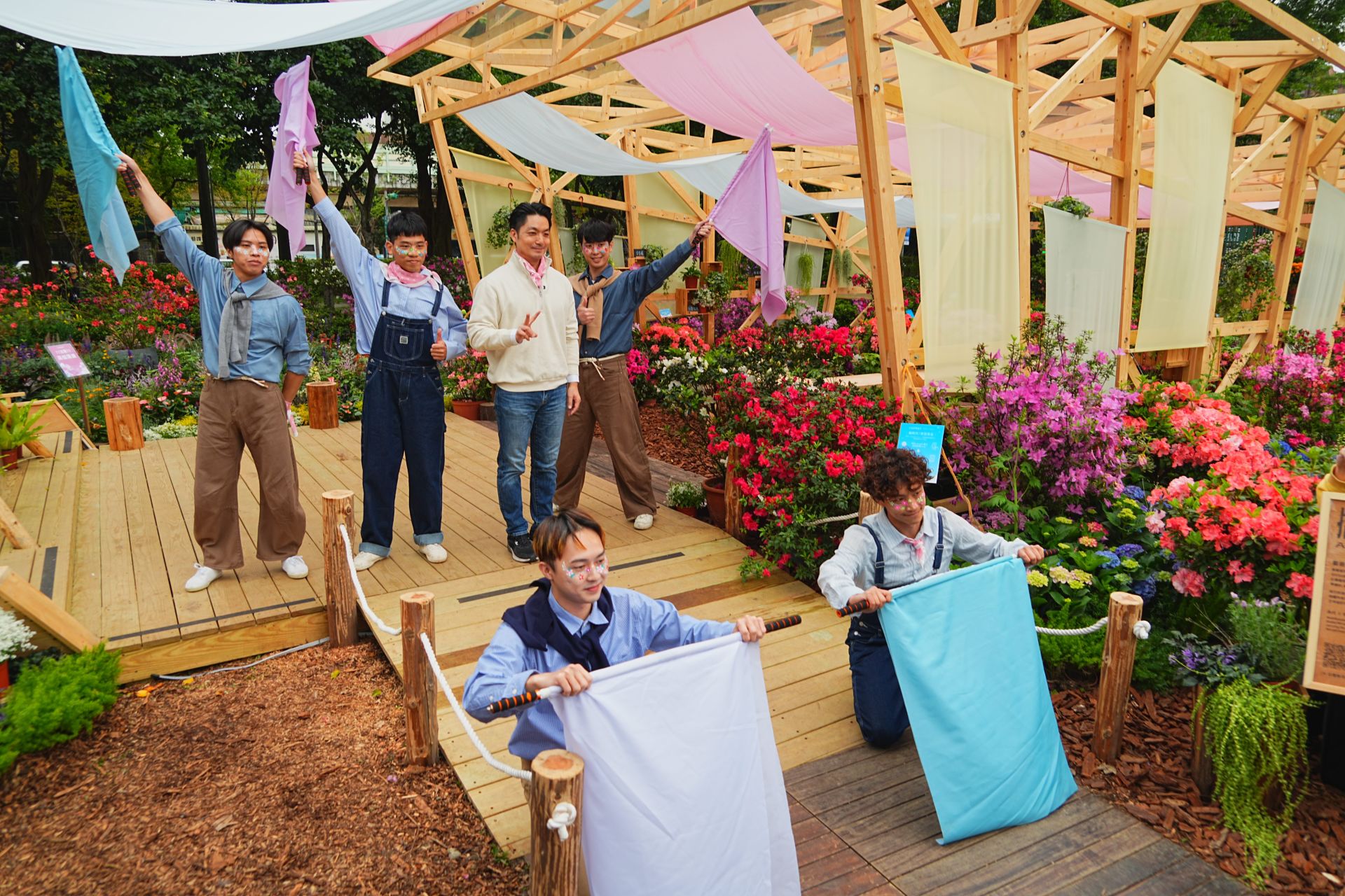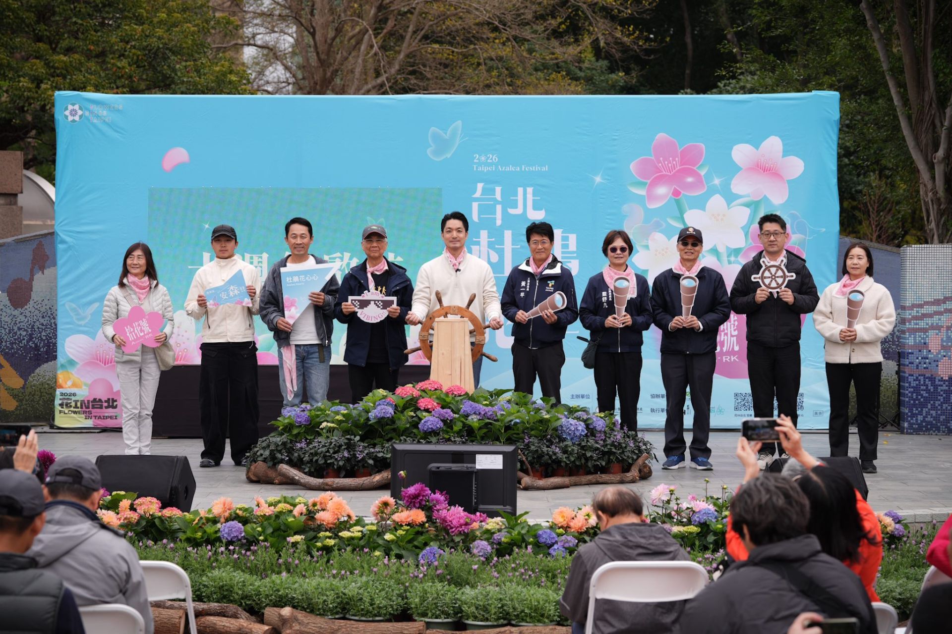 今年適逢杜鵑花季十週年,以「拾起十年春光.綻放台北之花」為主軸,將大安森林公園比擬為停泊於城市心臟的綠色方舟,並打造大型主題花藝裝置「拾花號 A’rk」杜鵑花屋,象徵承載城市生態與十年累積的春日記憶。主題活動儀式中,蔣萬安市長與貴賓一同轉動船舵,宣告「拾花號」正式啟航,隨後走訪拾花廣場,體驗花季主題遊戲市集、參觀杜鵑花屋,並與民眾熱情互動,讓整座公園都成為春日舞台,展現台北杜鵑花季「全民參與、共創城市春天」的精神。