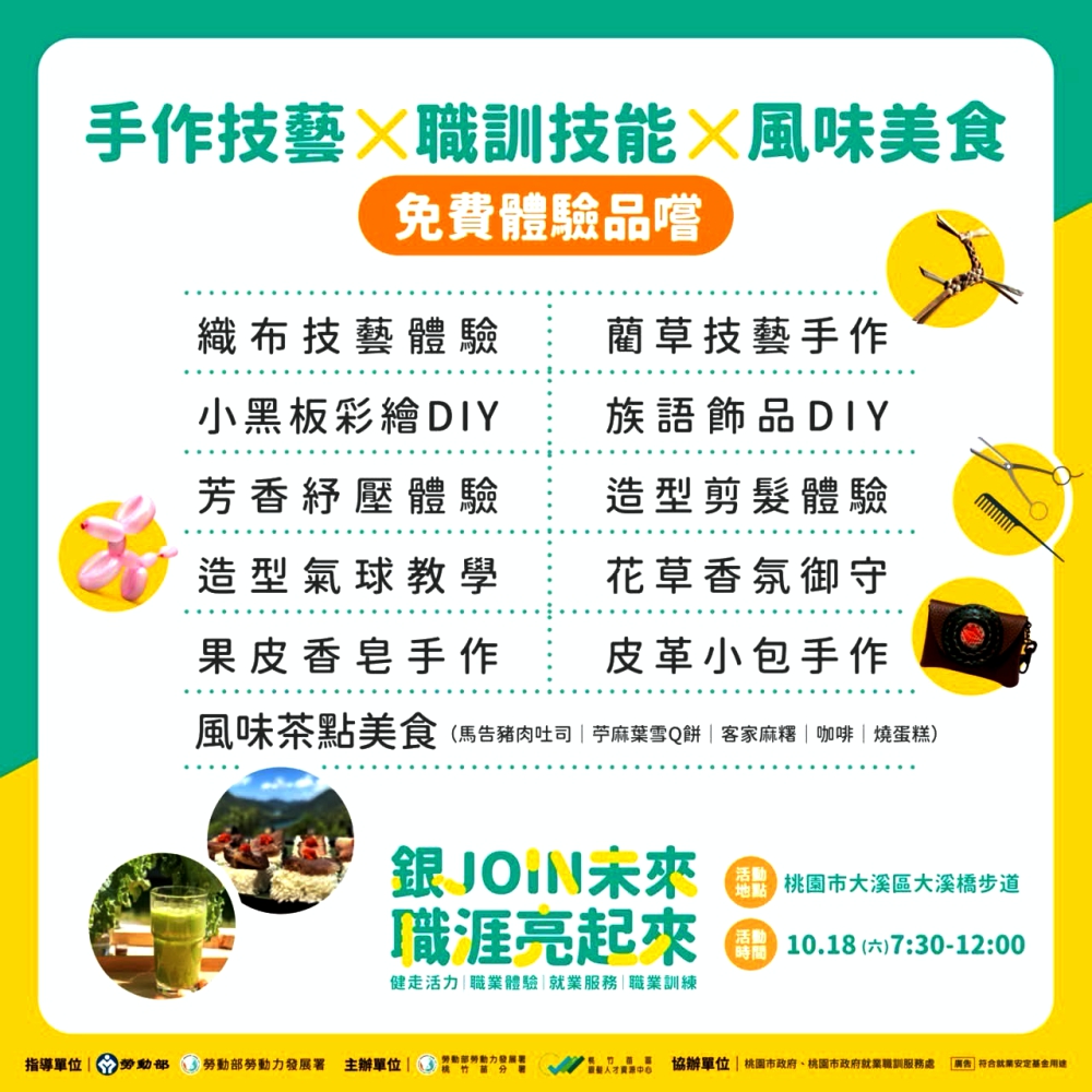 勞動部勞動力發展署桃竹苗分署於10月18日(星期六)上午7時30分至中午12時,在桃園市大溪區大溪橋步道舉辦「銀JOIN未來.職涯亮起來」健走活動,以「健康活力、職涯延伸、世代交流」為核心,結合健走、職訓體驗與就業服務宣導,號召中高齡民眾一同前來健走,展現中高齡族群的活力與行動力。現場也將設有互動闖關、主題市集等,同時,參加健走民眾可獲贈隨行造型帽、提袋等多樣好禮,前500名完成任務還可獲得限量精美禮物。