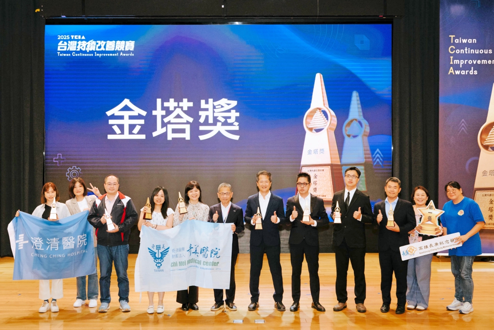 ▲2025年台灣持續改善競賽11月14日盛大舉行。中區周思源會長澄清醫療體系總院長(左5)與自強組金塔獎團隊合影。(圖/中衛發展中心提供)