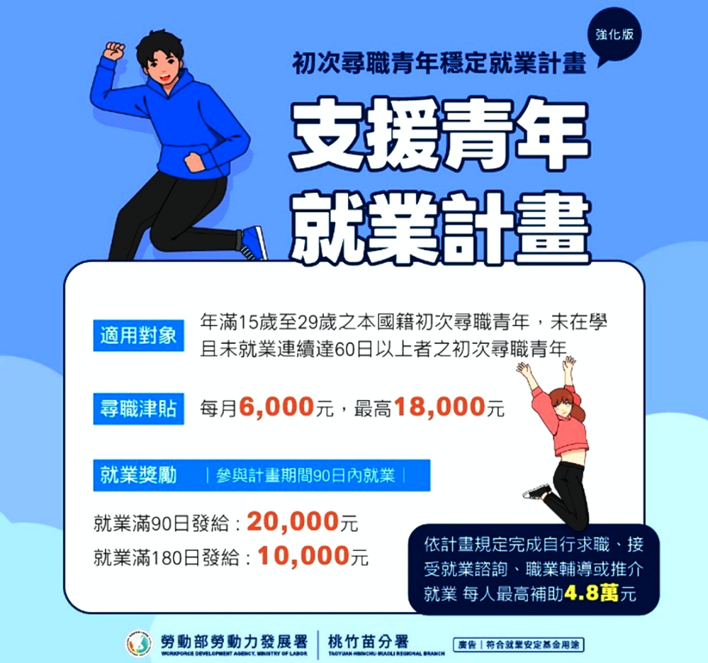 ▲桃竹苗分署積極推動「支援青年就業計畫」及「青年職得好評計畫」,促進青年順利就業並在職場穩定發展。「支援青年就業計畫」針對年滿15至29歲本國籍未在學且連續60天未就業的初次尋職青年皆可參加。(圖/桃竹苗分署提供)