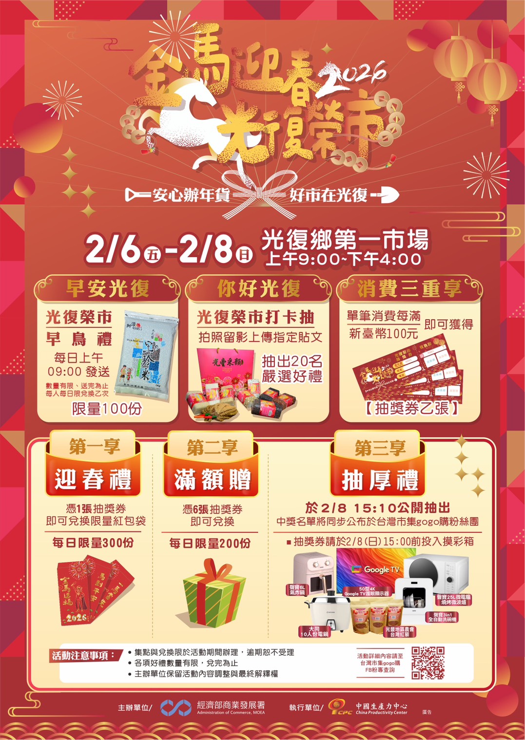 活動期間每日上午9時起進行「光復榮市.早鳥禮」活動,每日限量100份在地太巴塱黑珍米,送完為止,與民眾分享在地的農產,亦歡迎一早入場感受熱鬧的開市氛圍。另外還有「消費三重享」活動,凡於市集攤位單筆消費每滿100元,即可獲得抽獎券1張,不僅可以兌換活動限定的迎春紅包袋,集滿6張還能兌換在地特色商品;此外,每1張抽獎券均能參與「光復榮市.抽厚禮」活動,獎項包含50吋電視顯示器、自動洗碗機、微波爐及電鍋、氣炸鍋等多項好禮,消費越多、中獎機會越高,2月6日至8日快來光復市場辦年貨,並將好禮一起帶回家!.jpg)