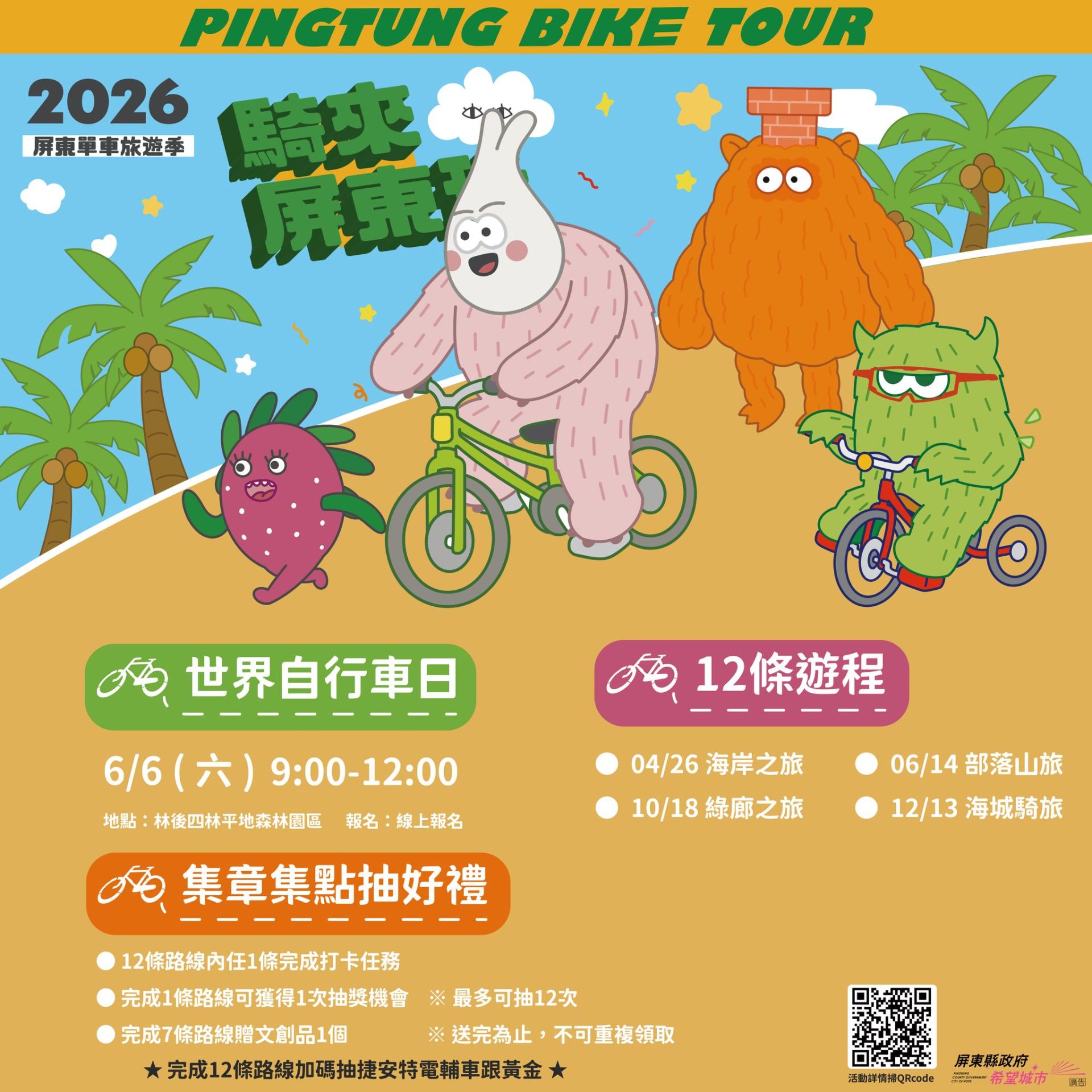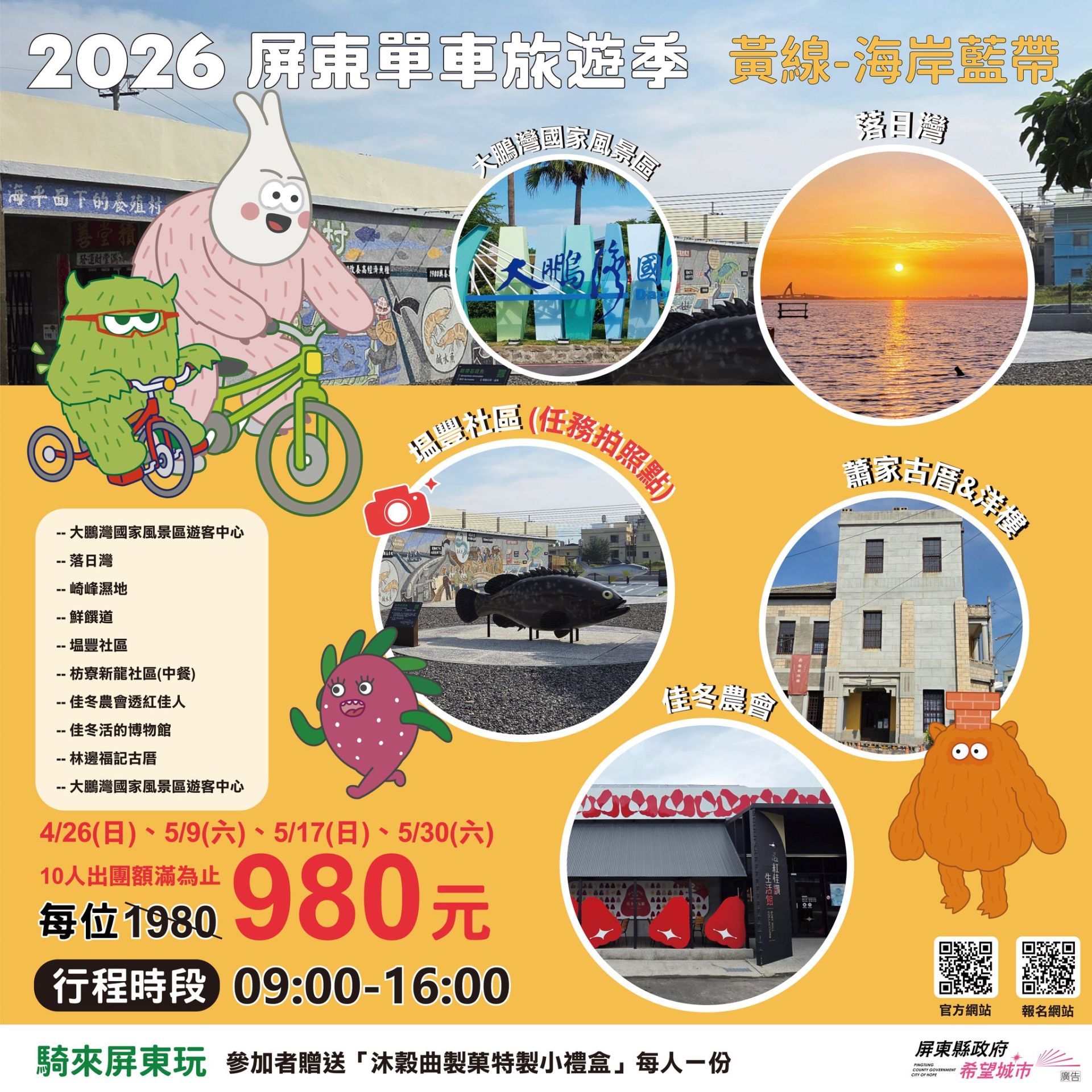 屏東縣政府表示,「2026屏東單車旅遊季」不僅是一場運動活動,更是串聯地方產業與觀光能量的重要平台,透過單車旅行,讓更多人看見屏東的山海魅力與人文風情,持續推動屏東成為全台最具特色的低碳旅遊城市。